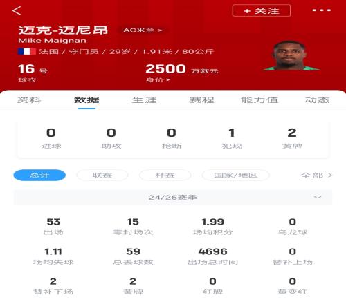 迈尼昂现年29岁,与AC米兰的合同仅剩最后一年,德转身价2500万欧。本赛季迈尼昂共为米兰出战53场比赛,完成15次零封。