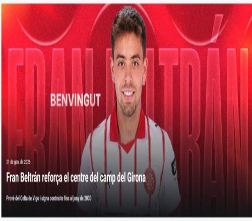 体育播报1月21日宣 赫罗纳足球俱乐部已与塞尔塔达成协议,弗兰·贝尔特兰将转会至赫罗纳,并签署了一份为期四年半的合同,直至2030年6月。