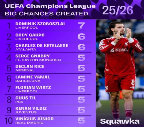 体育播报1月23日宣 本赛季,索博斯洛伊成为利物浦阵中创造力的源泉之一,尤其在欧冠赛场上。根据Squawka的数据统计,索博斯洛伊在欧冠中创造7次重大机会,位居所有球员之首。