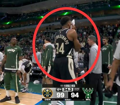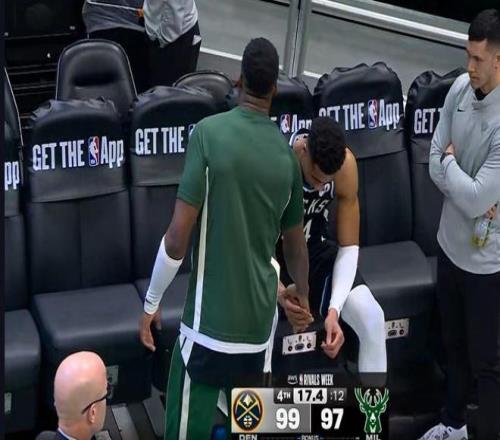 保护了自己全场,结果最后时候受伤,字母哥非常沮丧,默默就走回了更衣室。结果往更衣室走的时候,突然听到场上在欢呼,他又走回替补席坐在板凳席上看球。但是可以看到字母哥非常难受,捂着自己的脸很痛苦。