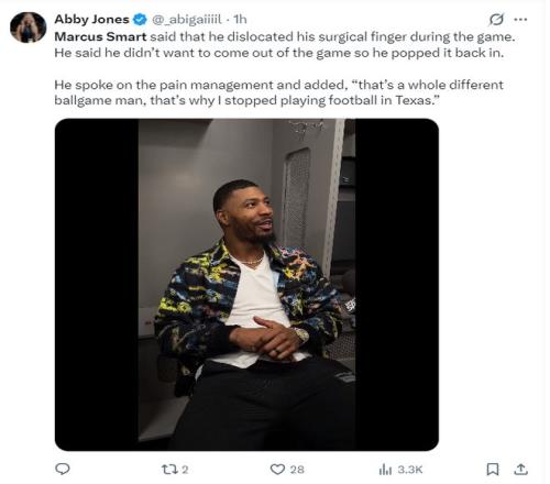 赛后斯玛特在接受采访时说:第四节在一次破坏球权时自己的右手食指脱臼了,为了自己不被换下场继续帮助球队我只好自行掰正复位,自己的右手食指曾经是动过韧带修复手术的。