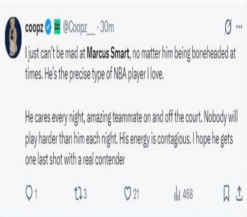 湖人媒体Coopz:我们都知道斯玛特有时候可能会在比赛中表现的愚蠢,但我就是无法对他生气,他正是我喜爱的那种类型。他每一夜晚都拼劲十足,无论是场上还是场下, 没人比他更有赛场感染力,他只要登场就是一个竞争者无论对手是谁。