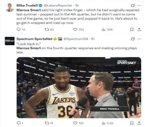 随后在詹姆斯上篮偏出时斯玛特从天而降完成补篮,这一球后湖人再度领先到3分,末节斯玛特拿到7分4篮板1助攻1盖帽(5中2+罚球5中3)。