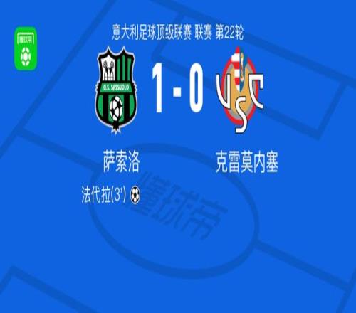 北京时间1月25日,意大利足球甲级联赛第22轮,萨索洛主场迎战克雷莫内塞。比赛开始后,萨索洛由法代拉破门得分。最终,萨索洛以1比0战胜克雷莫内塞。