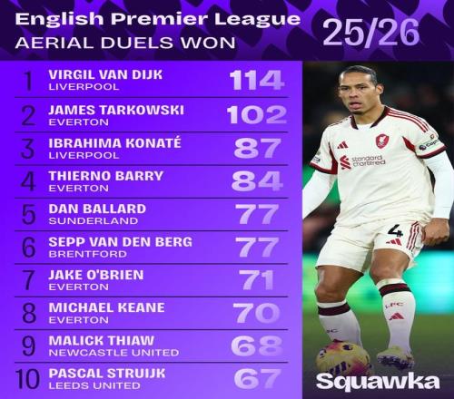 本赛季英超赢得空中对抗排名:范戴克第一,塔尔科夫斯基次席