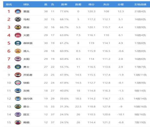 掘金赢球后32胜16负,排名西部第三,落后第二的马刺0.5个胜场。