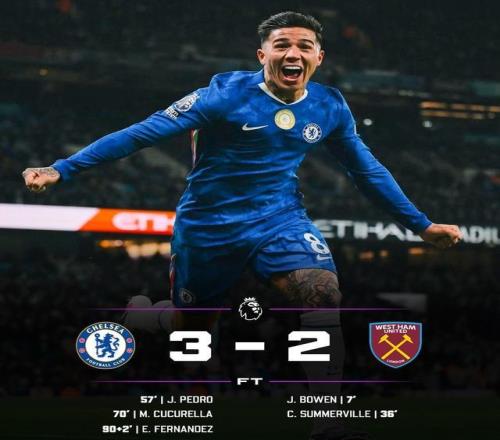 全场战罢,切尔西主场3-2逆转绝杀西汉姆联,上演让二追三惊险拿下3分,积40分来到英超第4,豪取各项赛事5连胜!